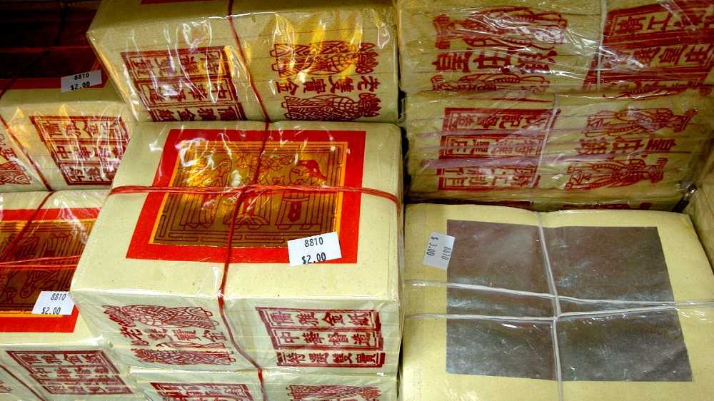Joss paper (simplified Chinese: ??; traditional Chinese: ??; pinyin: j?nzh?; literally: "gold paper", Chinese: ???; pinyin: y?ns?zh?, Chinese: ??; pinyin: zh?qián, or simplified Chinese: ??; traditional Chinese: ??; pinyin: míng bì; literally: "shade/dark money", also known as ghost money) are sheets of paper or papercrafts made into burnt offerings common in Chinese ancestral worship such as the veneration of the deceased family members and relatives on holidays and special occasions. Joss paper, as well as other papier-mâché items, are also burned or buried in various Asian funerals, to ensure that the spirit of the deceased has lots of good things in the afterlife. In Taiwan alone, the annual revenue of temples received from burning ghost money was US$400 million (NT$13 billion) as of 2014.
